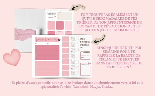 Outils Pratiques (Planners) : Plus de six mois (30 semaines) de pages de suivi pour les prières et les règles (non datés pour un démarrage du suivi n'importe quand dans l'année), des pages "emploi du temps" pour organiser tes semaines et des espaces de "Journaling" pour déposer tes pensées et tes objectifs de la semaine.